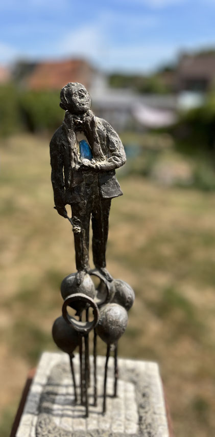 In 2001 werd ik samen met twee andere kunstenaars gevraagd een schetsontwerp te maken voor het Toon Hermans monument. Ik koos voor een poëtische vertaling van zijn oeuvre: Toon Hermans staand op zijn ballonnen, die uit het trottoir omhoog komen, symbool voor zijn luchtige en humoristische levenshouding. Het beeld, volledig in brons en ca. 3 meter hoog, kreeg een blauw glazen hemd als verwijzing naar zijn Mariale binding, de kleur blauw komt ook vaak terug in zijn liedjes en gedichten. In zijn linkerhand heeft hij een dode duif, de melancholie, afkomstig uit een act waarin hij als goochelaar solliciteert bij het circus. In zijn andere hand draagt hij een roos, de liefde, één van de 24 uit zijn lied '24 Rozen'. De overige rozen en het gedicht 'dag dag dag - lach lach lach - geef geef geef - leef leef leef' zouden in de bestrating terug keren.